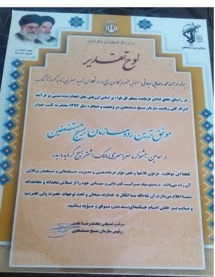 به گزارش پایگاه خبری تحلیلی کورنگ ،کانون بسیج ورزشکاران سپاه ناحیه کبودراهنگ در راستای تحقق تدابیر فرمانده معظم کل قوا،بر اساس ارزیابی های انجام شده مبتنی برفرآیند اشراف کلی ریاست سازمان بسیج مستضعفین در وضعیت و عملکرد سال 94مفتخر به کسب عنوان موفق ترین رده سازمان بسیج مستضعفین در سومین جشنواره سراسری مالک اشتر بسیج گردید.