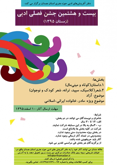 زندی افزود: امسال هیچ محدودیت سنی، چه در بخش آزاد و چه در بخش ویژه وجود ندارد و علاقمندان باید فایل word آثار خود را حداکثر تا 10اسفند95 به دفتر آفرینش های ادبی حوزه هنری استان همدان، واقع در خیابان شریعتی، روبروی بانک صادرات مرکزی، بن بست زرین تحویل داده و یا به پست الکترونیکی info@arthamadan.ir؛ با ذکر عنوان «جشن فصلی» در قسمت موضوع ایمیل؛ ارسال کنند.