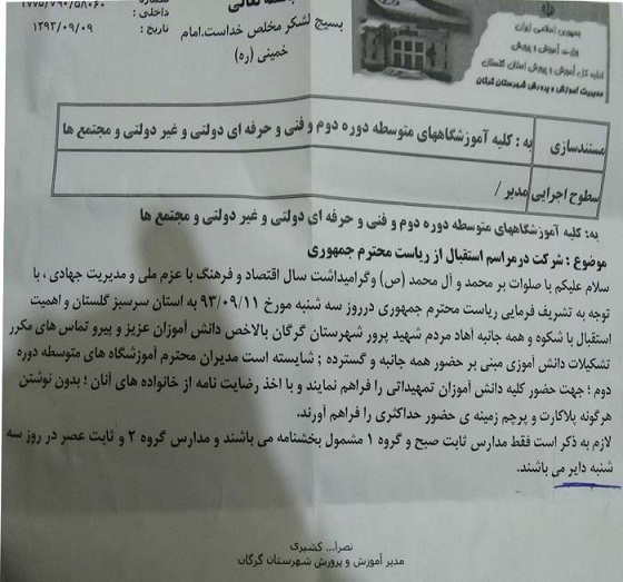 به گزارش کورنگ به نقل از خیبرآنلاین، علیرغم اینکه مدیرکل آموزش و پرورش اعلام کرد که هیچ مدرسه ای برای مراسم استقبال رییس جمهور تعطیل نمی شود ولی متاسفانه اکثر جمعیت حاضر در ورزشگاه را دانش آموزان گرگانی تشکیل می دهند. این درحالی است که متولی آموزش دانش آموزان گلستانی آحاد را به غلط "آهاد" نوشته است.