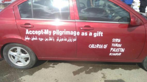 این طلبه که در قسمتی از خودرو خود طرح نوشته "زیارتم را به عنوان هدیه بپذیرید کودکان یمن، سوریه، فلسطین، میانمار " نقش بسته  می گوید من به نیابت از تمامی کودکان در جهان که فارغ از مذهب مورد ستم قرار گرفته اند به زیارت امام  حسین می روم.