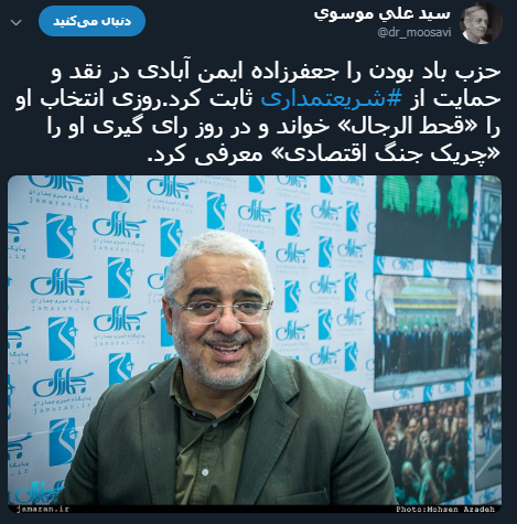 سید علی موسوی در صفحه توییتر خود نوشت: حزب باد بودن را جعفرزاده ایمن آبادی در نقد و حمایت از #شریعتمداری ثابت کرد.روزی انتخاب او را «قحط الرجال» خواند و در روز رای گیری او را «چریک جنگ اقتصادی» معرفی کرد.