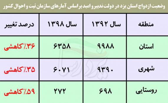 علوی راد با بیان اینکه در مناطق روستایی نیز تعداد سالانه ازدواجها از ۶۹۸ ازدواج در سال ۱۳۹۲ با کاهش ۵۹ درصدی به ۲۷۸ ازدواج در سال ۱۳۹۸ رسیده است عنوان کرد: بررسی های نگارنده نشان می دهد در دوره ۷ ساله دولت روحانی، کاهش ازدواج در مناطق شهری و روستایی استان یزد نسبت به متوسط کل کشور بیشتر بوده است.