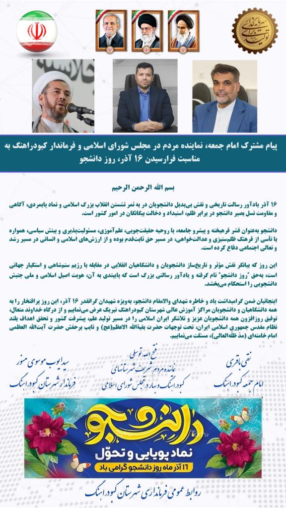 اینجانبان ضمن گرامیداشت یاد و خاطره شهدای والامقام دانشجو، بهویژه شهیدان گرانقدر ۱۶ آذر، این روز پرافتخار را به همه دانشگاهیان و دانشجویان مراکز آموزش عالی شهرستان کبودراهنگ تبریک عرض مینماییم و از درگاه خداوند متعال، توفیق روزافزون همه دانشجویان عزیز و تلاشگر ایران اسلامی را در مسیر تولید علم، پیشرفت کشور و تحقق اهداف بلند نظام مقدس جمهوری اسلامی ایران، تحت توجهات حضرت بقیةالله الاعظم(عج) و نایب برحقش حضرت آیتالله العظمی امام خامنهای (مدّ ظلّهالعالی)، مسئلت می نماییم.